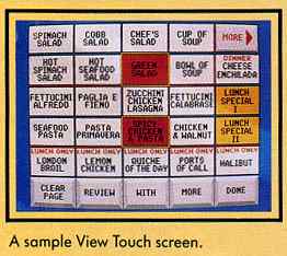 This is the first brochure ever created which announces the arrival of ViewTouch. It was produced by Ken Arnold, of Red Deer, Alberta, in the Spring of 1987. The View Touch point-of-sale restaurant computer, designed to replace a cash register (and perhaps even employees) in restaurants, is one of the first truly vertical applications for the Atari Mega. The ViewTouch $4999 system includes a Mega 2 with color monitor glass touch screen network hardware, 40-column receipt printer, software and cash drawer. The computer offers dozens of menu pages drawn with NEOchrome. To order a hamburger customers simply touch a hamburger icon. The Mega adds up the items figures the tax and prints out a receipt. Computerzed cash registers have been used in high-volume restaurants and fast food chains for years but the View Touch is different because "We've eliminated the need for keys," says View Touch president Gene Mosher. View Touch created an entirely new user interface for the product. The menu can be changed frequently and, according to Mosher, the software can be customized without programming. The system, which will be distributed primarily through cash register companies instead of computer dealers, is also sold with a 25-inch Sony monitor and can be used for business or classroom presentation graphics. There were several innovations which made this GUI so original, effective and successful. One was the repeating touchscreen `buttons' across the bottom of each of the bitmapped GUI pages. These were useful references to to an easier way to learn and to use the GUI because they did not change as you browsed from page to page of the restaurant's food and beverage menu. Ameritech (one of the regional Bell companies) patented this technique more than a decade after I began using it and I provided this magazine write-up as evidence of prior art to help prevent them SBC (another of the regional Bell companies) from attempting to enforce the obviously bogus patent. (Robert Cringely's narrative of this event.) Note, too, my innovation of the effect of a yellow light coming on within each `button' as it was selected. Visual feedback is essential. Users must immediately be made aware that the software has accepted their touch of the display. This effect has been embraced by GUI designers the world over and is an essential component of contemporary GUI design. . A great deal of point of sale software/systems research is underway in the academic world and at corporations. This search documents my early contributions to several fields, including application specific user interfaces, direct manipulation and point of sale GUIs. Teams are writing papers about the theories of developing point of sale system and building distributed network solution for a point of sale application. I supPoSe it is normal for this phenomenon to occur twenty years after I first invented such software and began demonstrating and marketing them worldwide but I do find it oddly entertaining that these people are explaining the theory a quarter century after the fact of the achievement. I'm more comfortable with things the other way around, with the theory preceding the achievement. Strange as it is, now that my software paradigm has been adopted worldwide, an IBM researcher, (Stefan Berner, IBM Switzerland) is writing things like "It is a waste of time to build the screens of a GUI by hand". If Stefan were to have asked, I would have informed him that, yes, for twenty years, nobody has been building the "screens of a GUI" by hand, at least around here they haven't. The GUI is, of course, automatically generated and rendered on the display by algorithms that give graphical life to the data itself. The graphical tools that do this job are so easy to learn and use that they don't even require documentation. Anyone with an average IQ need only to be able to read and write. The state of the art is, Stefan, and for twenty years has been, that the user has intuitive graphical tools that automatically build each user's own custom GUI. The news for Stefan is that anybody developing a point of sale system must NEVER have the job or the responsibility for building a customer's GUI in the first place. Customers demand the tools to do their own GUIs. The only issue is, do they exist or not. And yes, they do. (Beyond PoS) The way that a restaurant's menu is represented on a graphic touchscreen is an exercise in creating a virtual reality, one that mimicks the way that a spoken language is used in a restaurant. What's real about it is the extent to which it can successfully mimick language in that context. Someone who is trying to make use of the virtual reality has to be able to readily understand how to navigate within it. If the VR does a good enough job of mimicking the way that any spoken language is used in a restaurant or bar then it helps the people there more than it impedes them. That's the measure of the success of the software and hardware. The thing about graphic touchscreen point of sale systems is that they have to provide a totally satisfactory way of mimicking the way a spoken language is used in any food and beverage (restaurant, bar) context. Whatever anyone can speak in a restaurant or bar has to be able to be communicated intuitively and without hesitation on the touchscreen. Everything about the GUI has to be specific to the way that people talk (communicate) and work there. Since the beginning of my work I have known that the graphics components in any touchscreen system have the potential to be the functional equivalents of words, ideas and concepts. They can be used and manipulated in a way that is analogous to the way we use words, and the way that we develop, discuss and refine concepts. Languages can be built out of the images in much the same way that languages are built from sounds, words and sentences. The pinnacle of spoken language is civilization itself. What will the pinnacle of graphical languages be? We'll find o